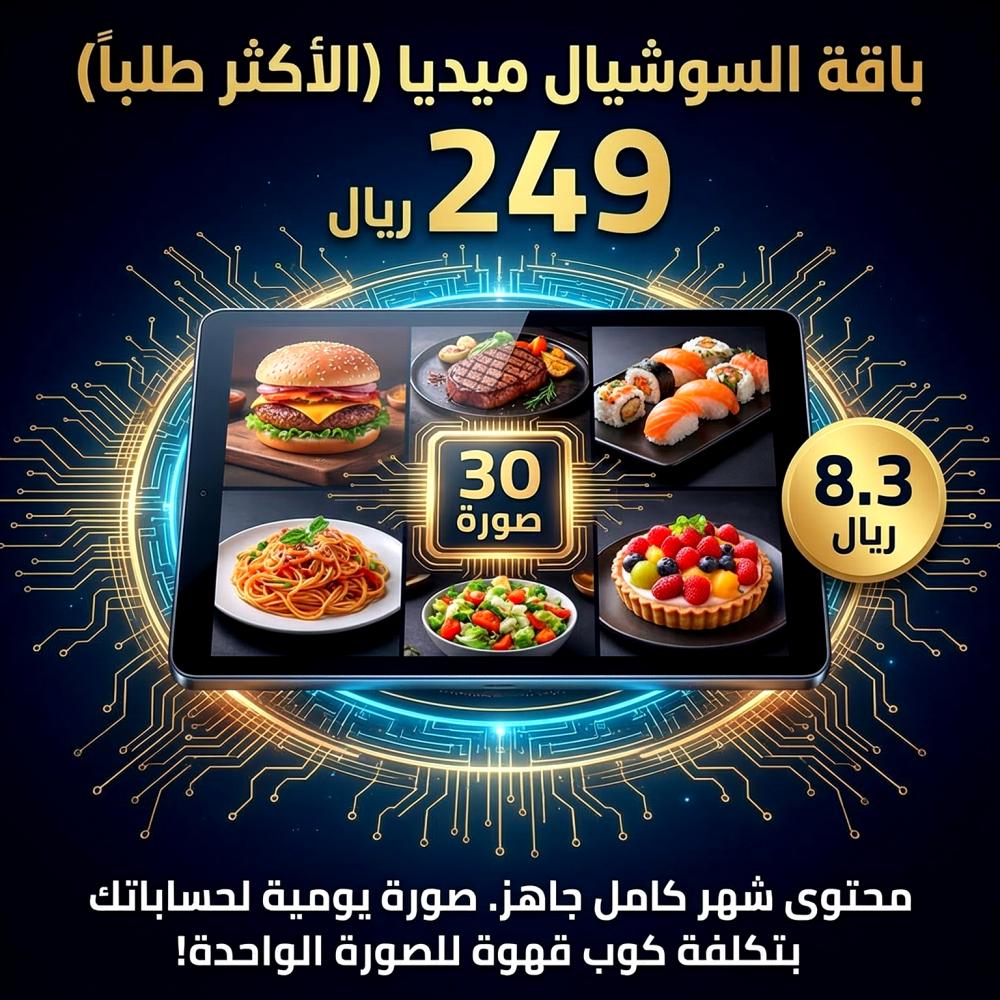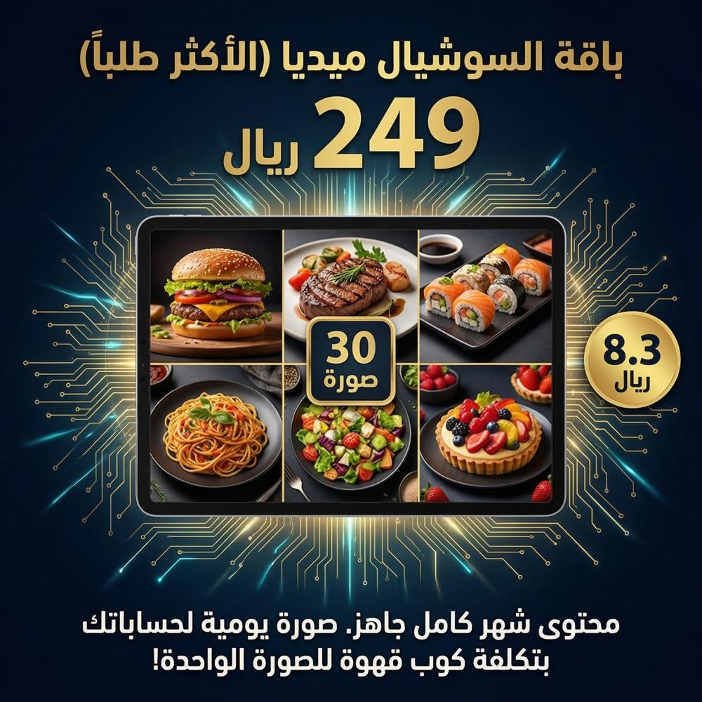 نقدم لك "باقة السوشيال ميديا الأكثر طلباً"، الحل الذكي والشامل لمشاريع الأغذية والمشروبات. احصل على محتوى بصري جاهز وعالي الجودة يكفيك لمدة شهر كامل، لتبقى حاضراً في أذهان عملائك كل يوم.